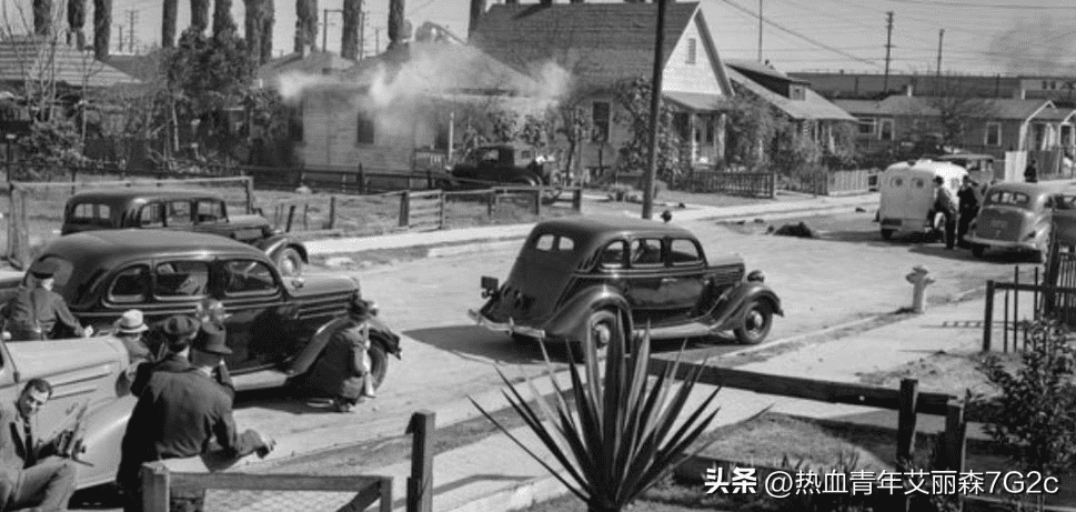 1938年2月17日,在洛杉矶的一处街道上,发生了激烈的枪战。警察正在追捕嫌犯,眼看无法逃脱,嫌犯进入了路边的一处房屋,警察也只得下车,借助警车作为掩体,和嫌犯交火,这一幕被不远处的路人用照相机拍下。