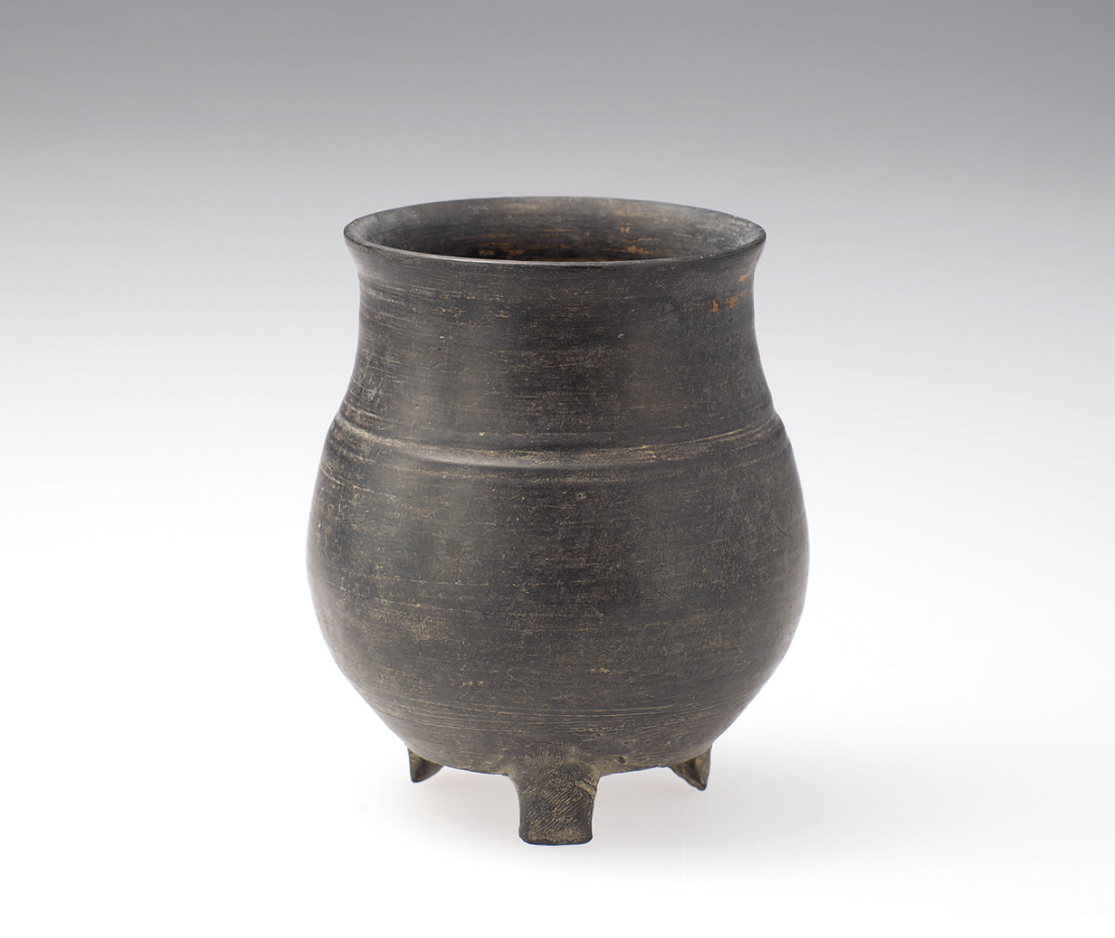 泥质黑陶。口微侈,粗高颈,窄肩,腹微鼓,平底微凹,三矮凿形足。腹饰弦纹,腹部安绳索式把,外底部刀削痕明显。
