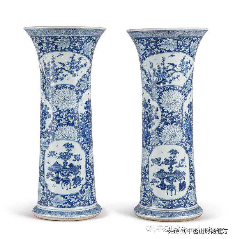 纽约苏富比拍賣2021年3月12日–24日博古:亞洲藝術珍品清康熙青花博古花鳥圖大花觚一對成交价12,600美元