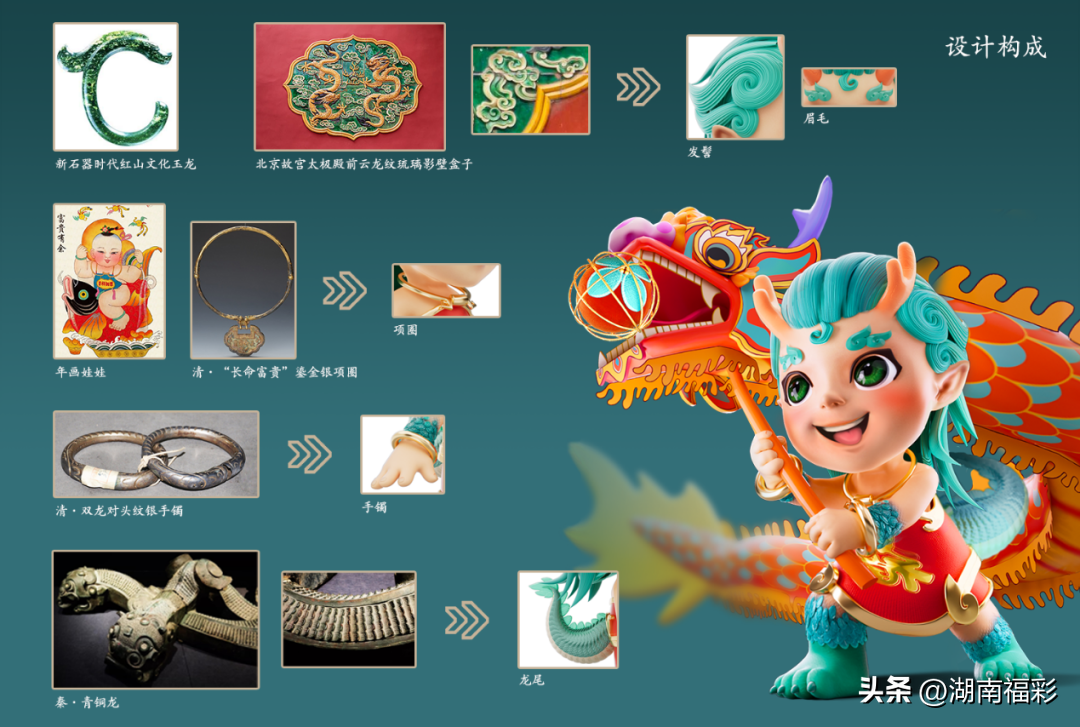“小瑞龙”身上的配饰源自大家熟知的年画娃娃,在中国传统文化中,佩戴长命锁、长寿镯寓意健康长寿、吉祥如意。以清代“长命富贵”鎏金银项圈和双龙对头纹银手镯为设计灵感,将文物进行二次创作,打造出更符合“小瑞龙”形象的金色项圈和手镯。小瑞龙身上的龙鳞则以秦朝青铜龙为参考,栩栩如生、生动灵巧。