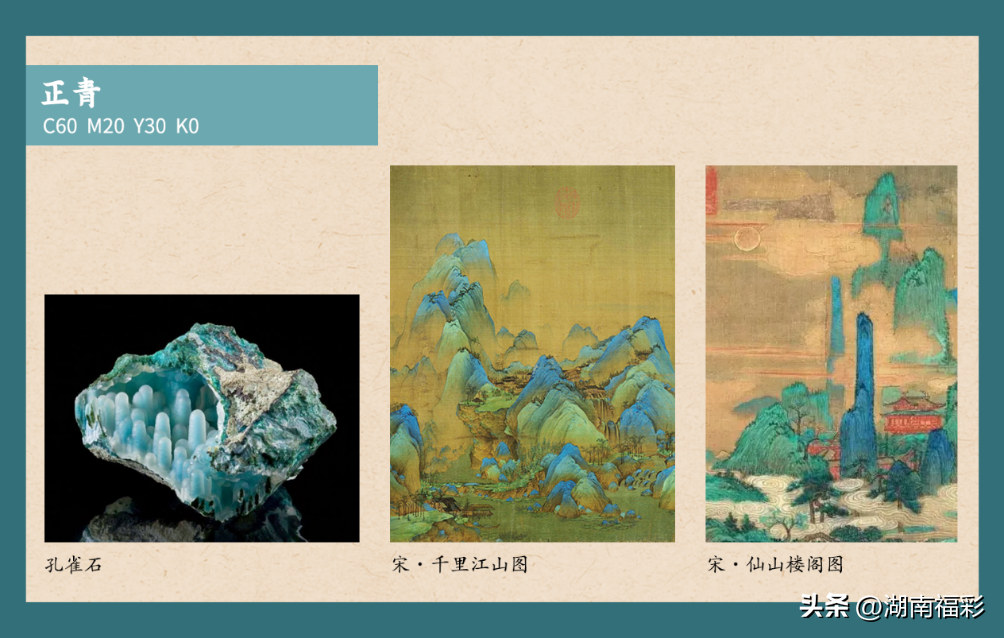 在中国的正色系统当中,青,表东方色。古时青色含义较为复杂,可当作绿、蓝、黑色使用,提取原料也从早期的蓝草、青金石、孔雀石、石青矿、蓝铜矿发展到明代进口的苏麻离青。青作为北宋之精魂,以青绿山水发扬光大。