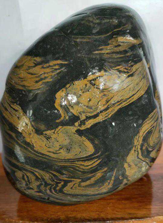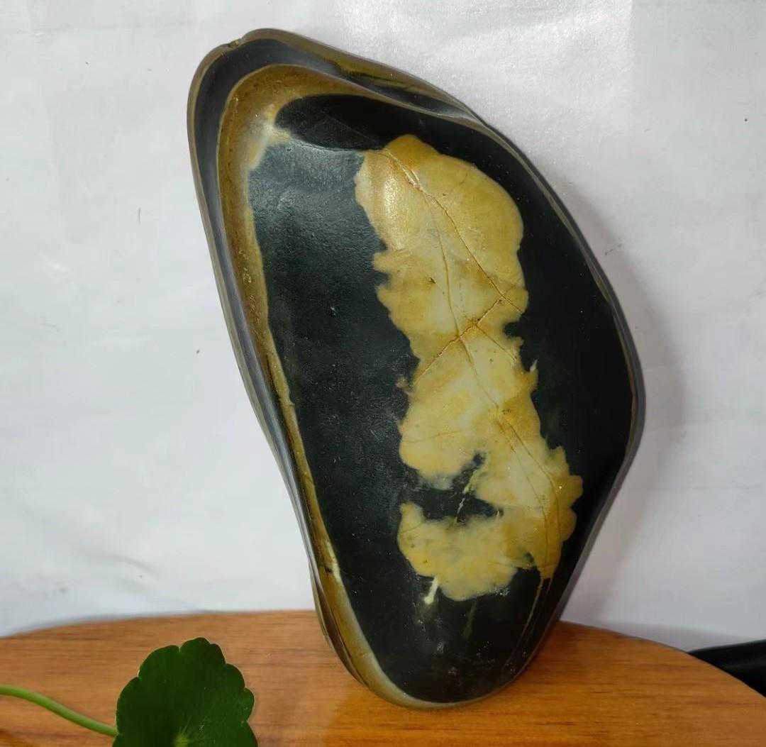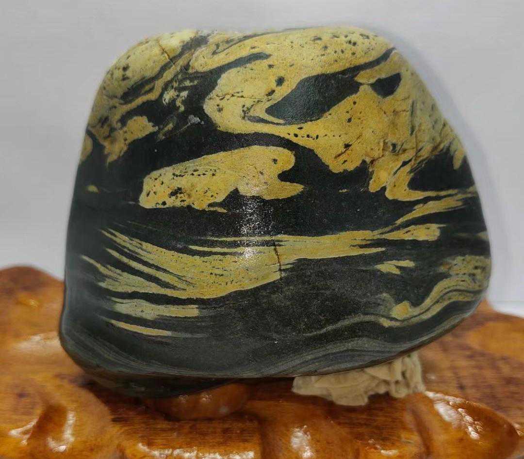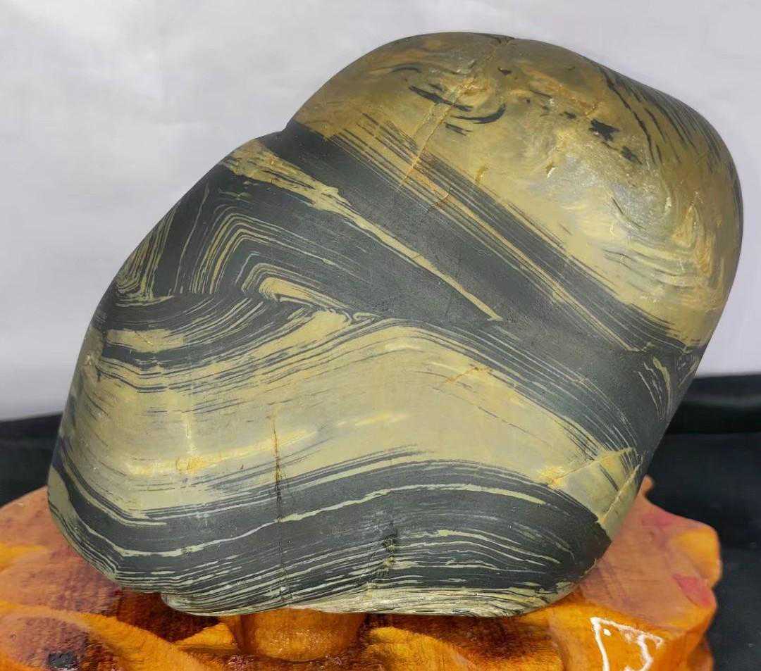 变质泥质硅质岩,石质致密坚硬,为隐-微晶结构,纹层状构造。此类黄河画面石多以黑色为底,黄白色纹理如丝飘动、如水流过形成各种动感十足的图案,其自然天成的色彩和纹理清晰逼真,宛若行云流水,俗称水纹石。