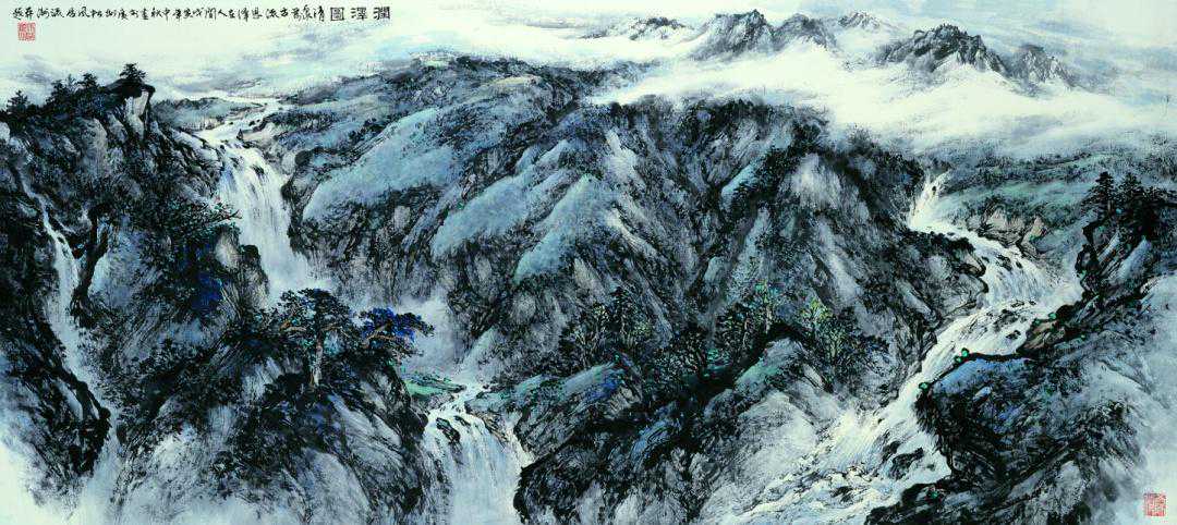 马流洲先生的笔墨精炼老辣,在一挥一洒间意象万千,让山水仙境显于画前;其画面内容极为丰富,有深壑重峦,有茫茫烟霭,有奇峰怪石,有葱郁林木,有急流瀑布等,这若影若现的山水秘境宁静而致远,让人在平面二维画布间,亦能习得山水之语,令人回味无穷。