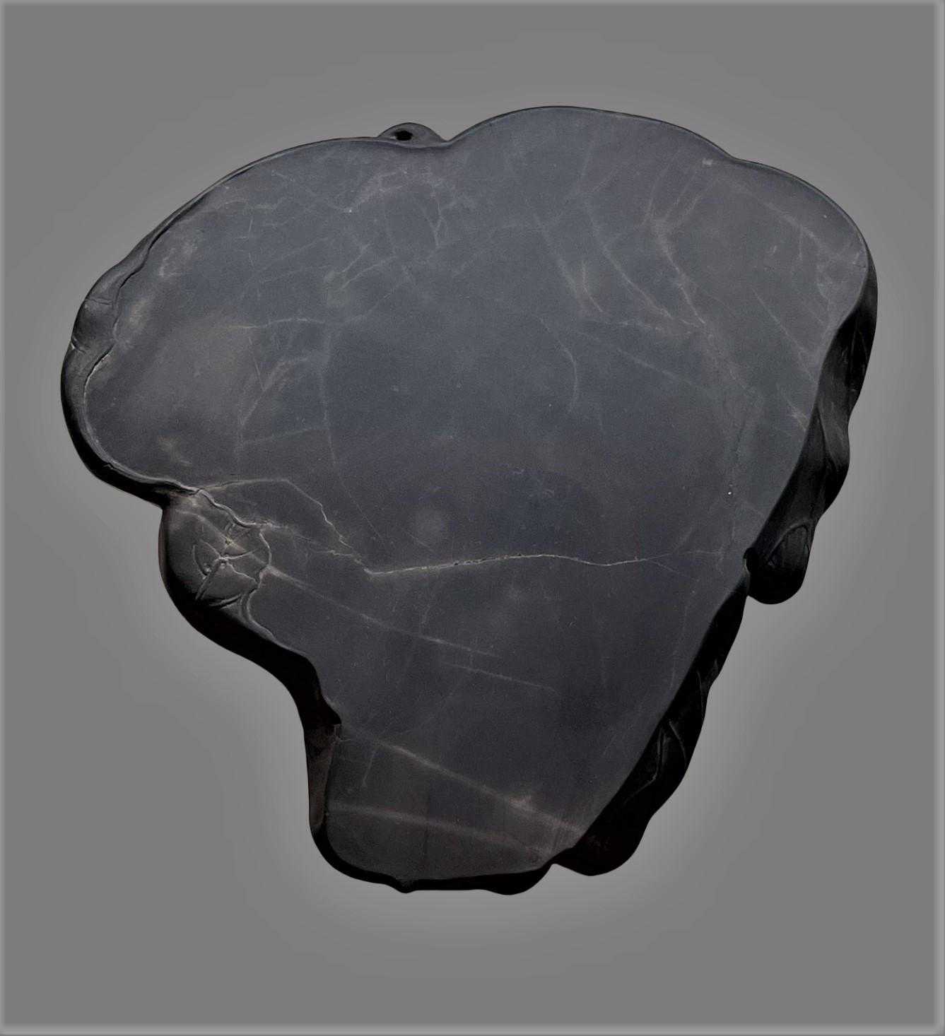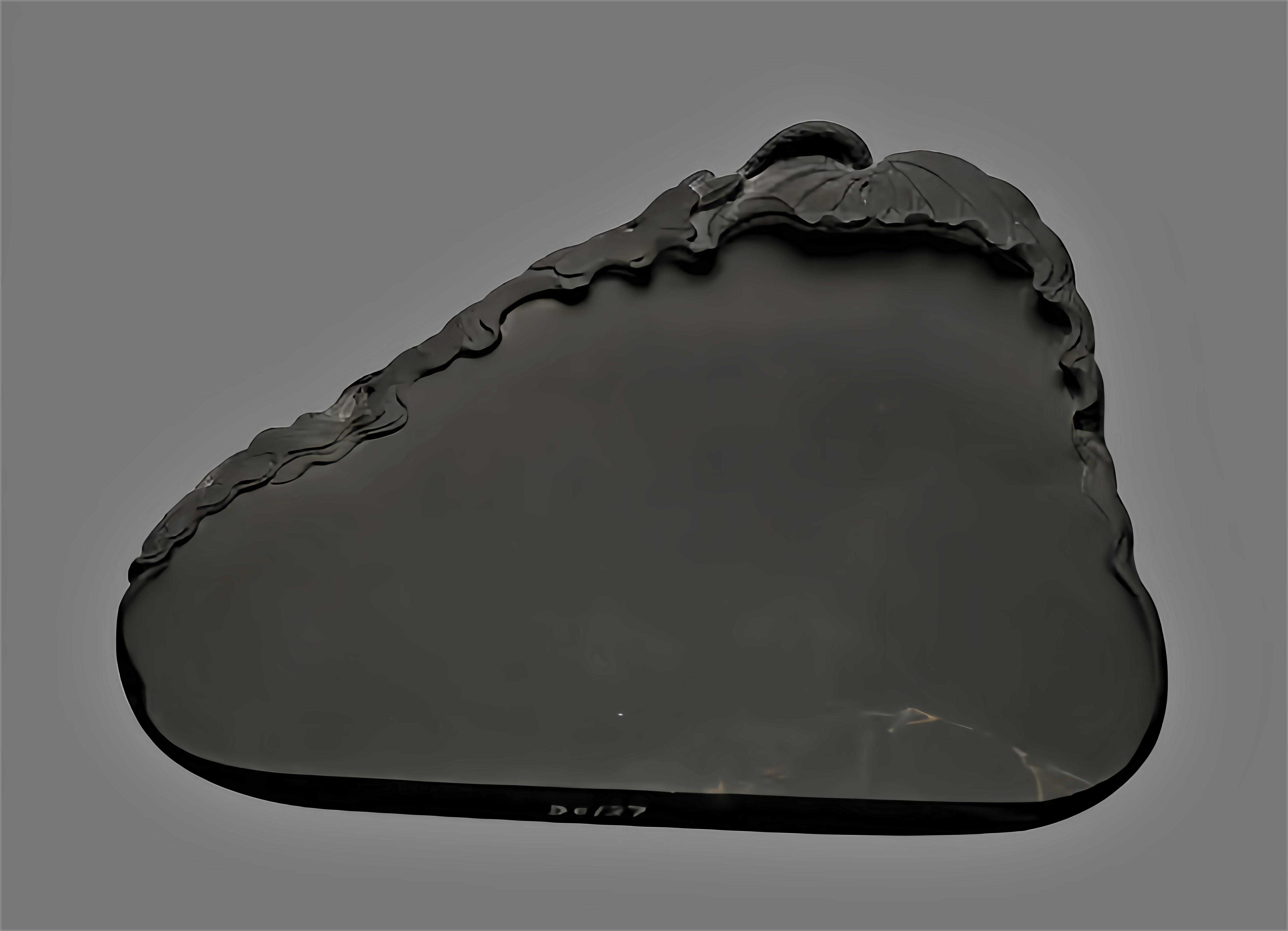 老坑石。石色青灰微带紫蓝。石品花纹绚丽多姿。砚背随形巧雕梧桐叶纹,生动别致。