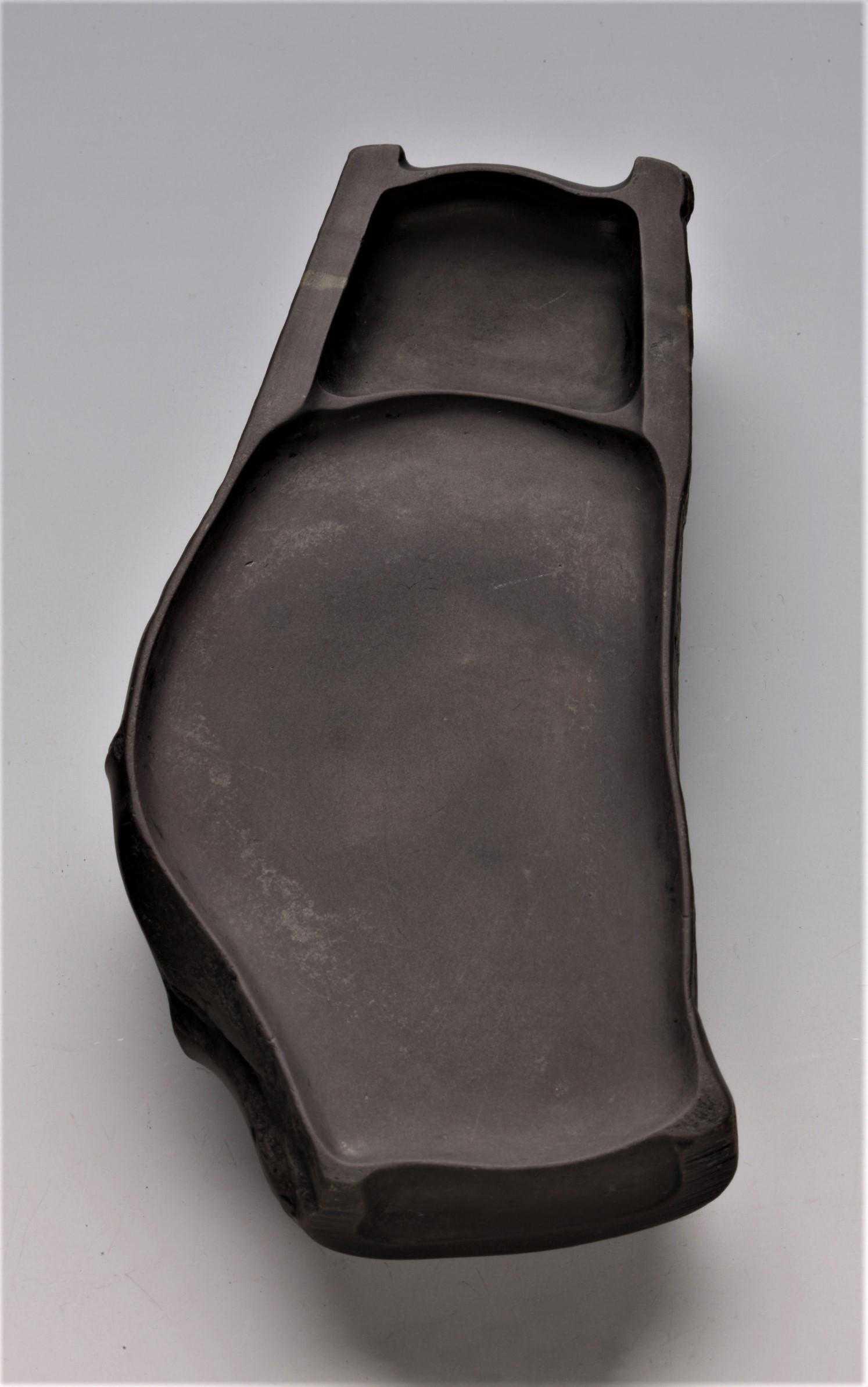 老坑石。砚形如螺蚌,螺身的砚堂可磨墨,螺口的涡形池可用作舔笔。