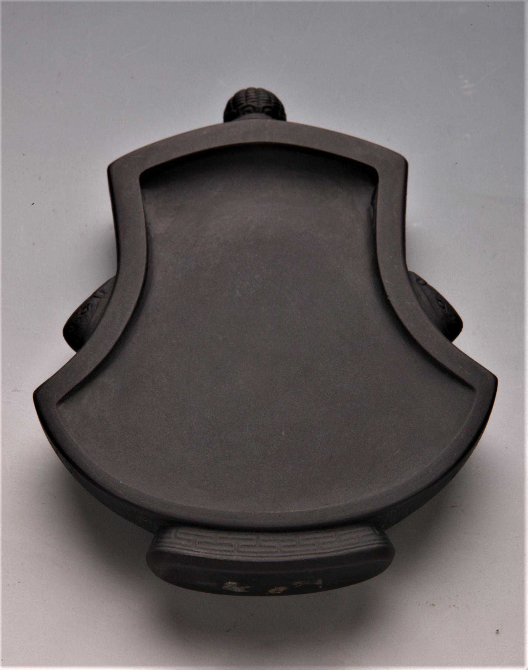 老坑石。石色青灰稍带紫蓝。砚堂遍布金线。砚作佛手形,形状逼真。佛手为南方地区出产的种植物果实,形象似手,谐音“福寿”,在广东传统工艺中较为常见。