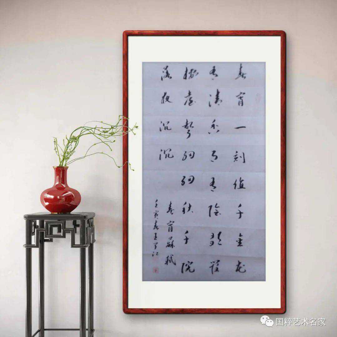 王学江先生采用行草的形式行云流水般的将这首词的气势与气魄淋漓尽致的展示出来,在追求端庄的基础上以重笔醒目,以轻笔求变但志在意趣。其实,仔细品读先生的作品,书中情、禅中意,字字如莲花、笔笔有梵音,使人如饮香茗、如沐春风,忘却浮躁和喧嚣,在欣赏艺术的同时得到人生的感悟。