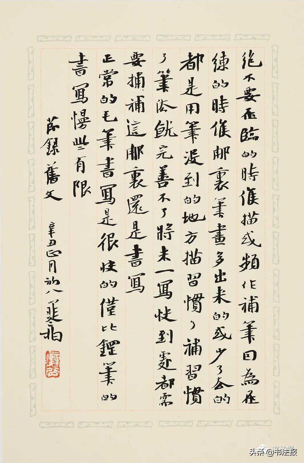 他的大楷从笔法渊源上取自唐宋,北海的沉雄,东坡的意趣,山谷的气象,在他的笔下得到相应的整合,故写来有一股恢弘嘡哒之气。其用笔坚实肯定,落落大方,重按轻提之际,尽显娴熟。露藏随心,敛纵自如,不斤斤于楷法的严峻而将书写的意趣贯注其间,有许多行书化的用笔,打破了严格意义上楷书起笔、行笔与收笔的套路。如起笔似藏非露,行笔铺排豪纵,收笔自由自在,看似无法而法在其中。或许他在用笔的内在理趣上深得赵吴兴三昧。他的结字,我以为是改变了东坡趋扁而心仪山谷的纵势,这样使每一个字构都挺然森秀。他似乎对字构没作长方扁不同形状的变化处理,而是一以贯之的纵势,略带欹侧,呈现出一种渐趋成熟的书写范式。正是这种自由奔放的用笔与劲挺欹宕的结字,成就了崔寒柏的大楷意味——不事雕琢,笔随意运,字构紧结,内气充盈。在章法上,除了标题与落款用行草作大小变化外,正文全以3字1行,每个页面9字,有一气呵成之妙。
