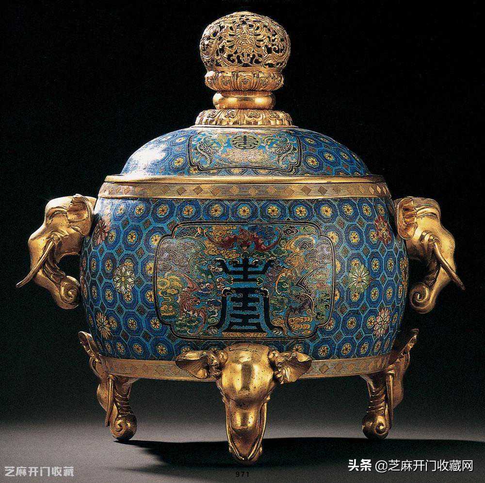 3:清十八世纪初掐丝琺瑯鎏金五福捧夀盖炉,尺寸:高49.5厘米,成交价:HKD657,250