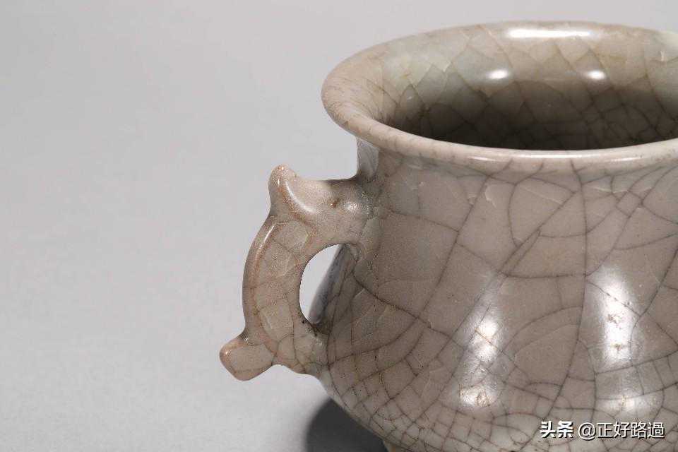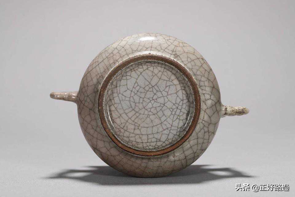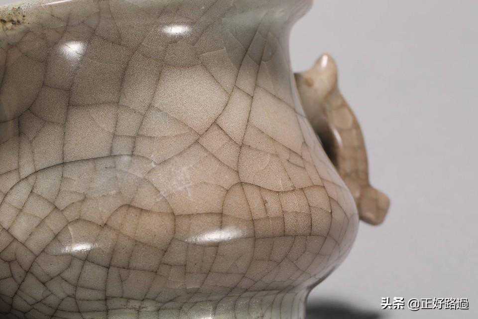 此香炉侈口,鼓腹,圈足,肩部双鱼耳式,整器型制规整,庄重沉稳,古朴大方,制作精致。通体施哥釉,釉质莹润,周身纹片纵横,深者呈紫褐色,谓之“铁线”,浅者则为金黄色,谓之“金丝”,大小纹片相间,深浅二色交织,漫无定律,云舒天机,自然的创造具有至高的美。