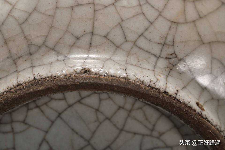 “哥窑”名列宋代五大名密,在陶瓷史上有举足轻重的地位。哥窑胎多紫黑色、铁黑色、也有黄褐色。釉为失透的乳浊釉,釉面泛一层酥光,釉色以炒米黄、灰青多见,釉面大小纹片结合。经染色后大纹片呈深褐色,小纹片为黄褐色,也称‘金丝铁线'“墨纹梅花片”“叶脉纹”'文武片'等。这是传世哥密的主要特征之一。器形有各式瓶、炉、尊、洗及碗、盆、碟等。多见仿古造型,底足制作不十分规整,釉面常见缩釉和棕眼。
