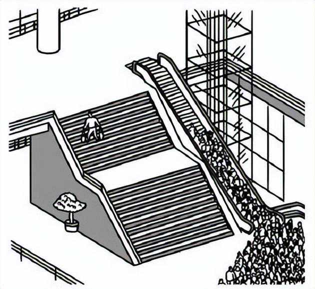 空旷的楼梯只有一个人,狭窄的电梯却挤满了人。
