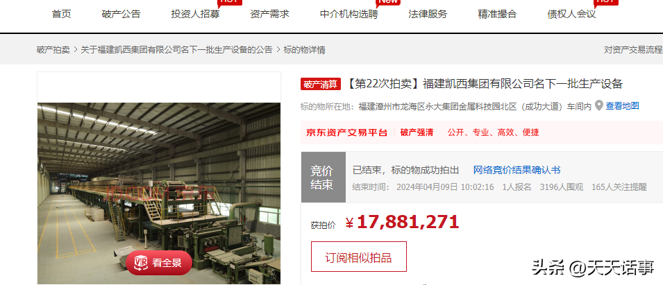 4月9日,在福建漳州市网上拍卖市场上,出现了一宗跟破产公司资产有关的拍卖,福建凯西集团有限公司名下一批生产设备被拍卖,这些设备存放在漳州市龙海区永大集团金属科技园北区(成功大道)车间内。