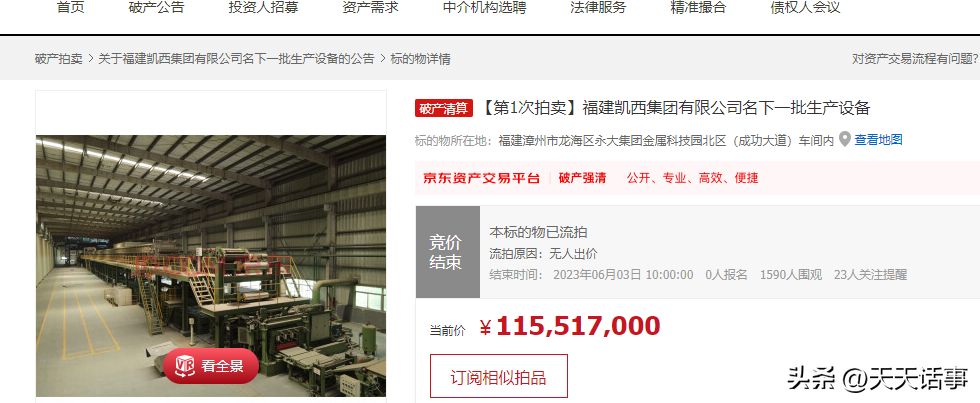 此次拍卖的生产设备,不是轻飘飘的生产设备。资料显示,福建凯西集团有限公司成立于2003年,其旗下有多家子公司,包括福建凯西钢铁有限公司、福建凯西不锈钢有限公司等。这两家子公司都在漳州市。此次拍卖的生产设备就是钢材生产有关的大型生产设备,包括连续热镀锌生产线、镀锌机组设备基础、不锈钢精整拉矫机组、不锈钢薄板冷轧机组设备、镀锡生产线等。这些生产设备都是非常重的,如果拆迁搬运都需要投入巨大成本。