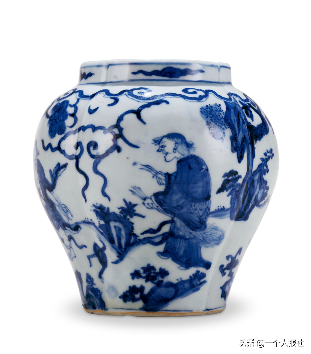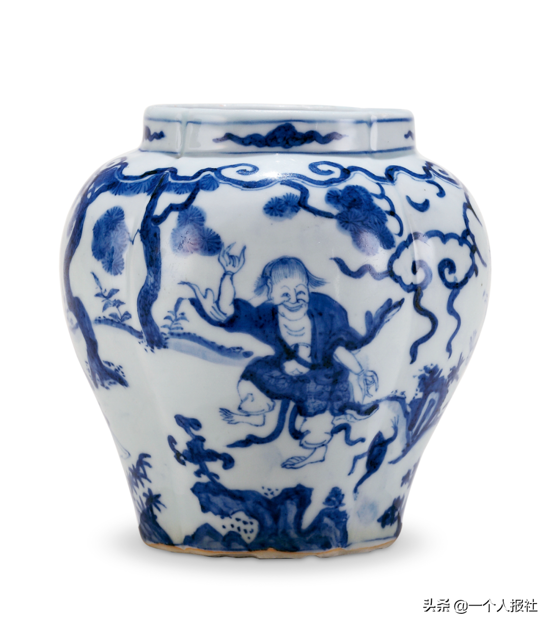 本品正是一份反映嘉靖皇帝此番信仰之例证,其主题纹饰独特,通景绘饰“蓬头四仙”图。画中所绘铁拐、刘海、寒山、拾得四仙,秃顶披发,因皆不施巾帻,谓之“四蓬头”,为元明时期民间喜闻乐见的艺术题材,正是源于嘉靖皇帝对道家的推崇,“蓬头四仙”题材才得以首次出现在明代官窑瓷器之上。本品所绘四仙布置错落,姿态各殊,形骨古野,怪戾骇俗:铁拐李侧首仰视,双目有神,一手扶持拐杖,一手托着葫芦宝物;寒山笑容盈盈,双手执卷而立;刘海手舞足蹈,嬉戏金蟾;拾得手携扫把,欢喜前行。纵观全图,放笔纵墨,轻盈飘逸,诸仙情势具佳,形象诡怪,得妙趣于天然,一如明初名家商喜之作《四仙拱寿图》,运笔刚劲有力,气势挺健,饱满而富有弹性,自见飘逸之气。对四仙的嘴、眉、颧骨均加以强调,使形象更具冲击力和生命力,尤其对嘴部的夸张表达,突出了“笑”态,增强了画面的喜庆气氛,予人观之,忍俊不禁,深受感染。