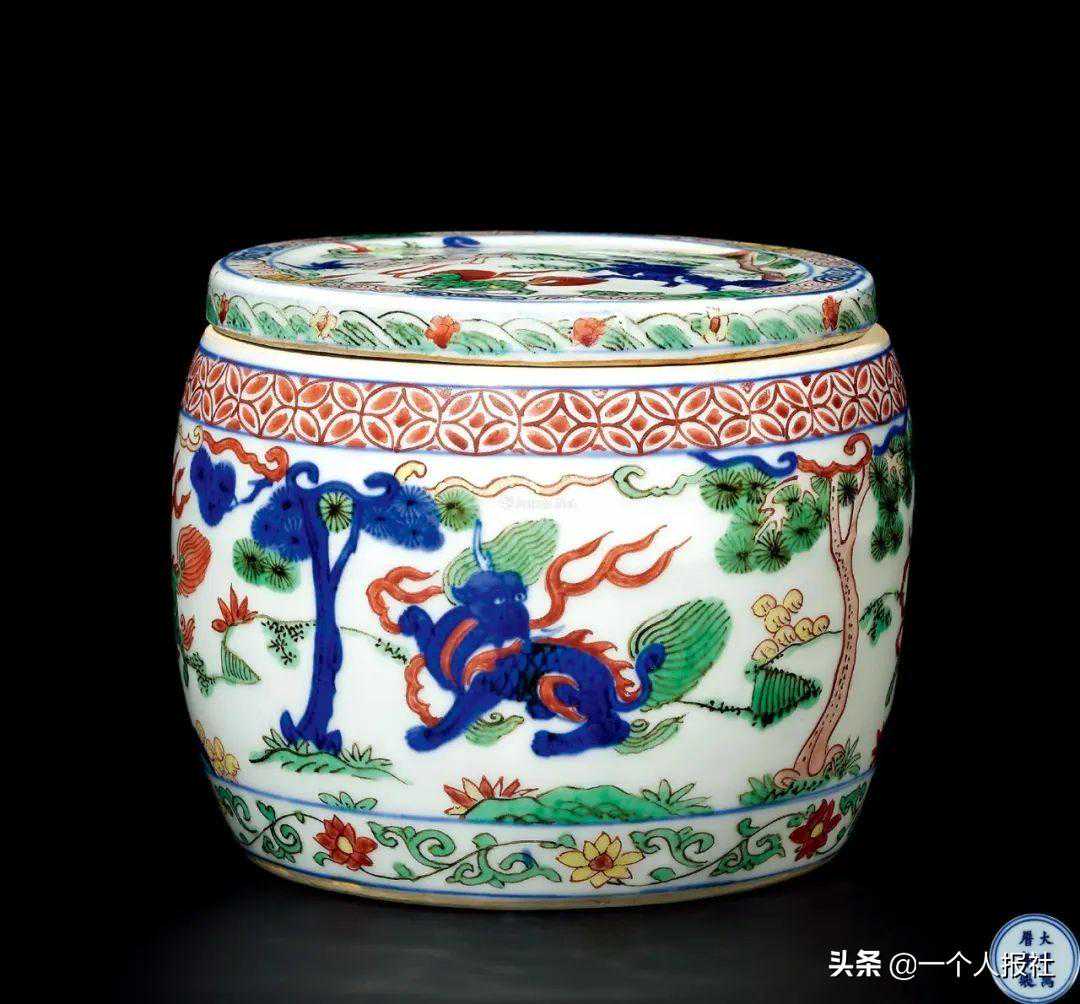 明成化青花海水江崖矾红彩龙凤纹盖罐