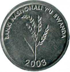 卢旺达1法郎硬币法郎是卢旺达的货币1964年,当局发行1、5和10法郎硬币,1和10法郎以白铜制成,5法郎则以青铜制成。1969年,新款铝制1法郎硬币发行,1970年发行的½和2法郎硬币亦以铝制成。1974年面积缩小的10法郎硬币发行,1977年黄铜制的20和50法郎硬币发行。2004年,以下面值的新款硬币发行: