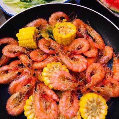 3、开小火把明虾倒进锅,撒上料酒、淋上花生油和盐焗粉。切记哦盐焗粉不要放一整包三分之一包就好否则太咸。然后把盖子盖上焖。