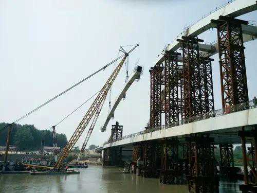 ③对于特大跨径拱肋吊装,当前一段拱肋(箱)扣挂后,会对前面已经扣挂好的拱箱产生影啊,因此,每挂上一段拱肋(箱),都要对相邻两三段拱箱的索力进行调整。调整时,主索跑车吊点仍然吊住当前拱箱段,逐步调整相邻拱箱的索力来调整拱箱标高,当符合要求时慢慢放松跑车吊点,重新观测拱箱标高,符合要求后才能拆除跑车吊点,进行下段拱肋的安装。