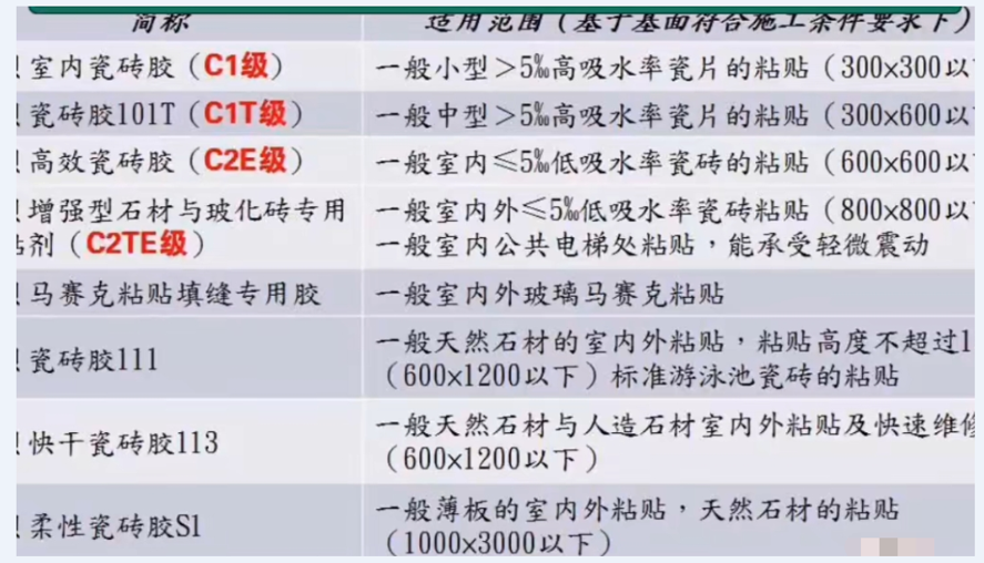 简单来说就是一个原则:吸水率越低,尺寸越大,需要的瓷砖胶等级就越高。