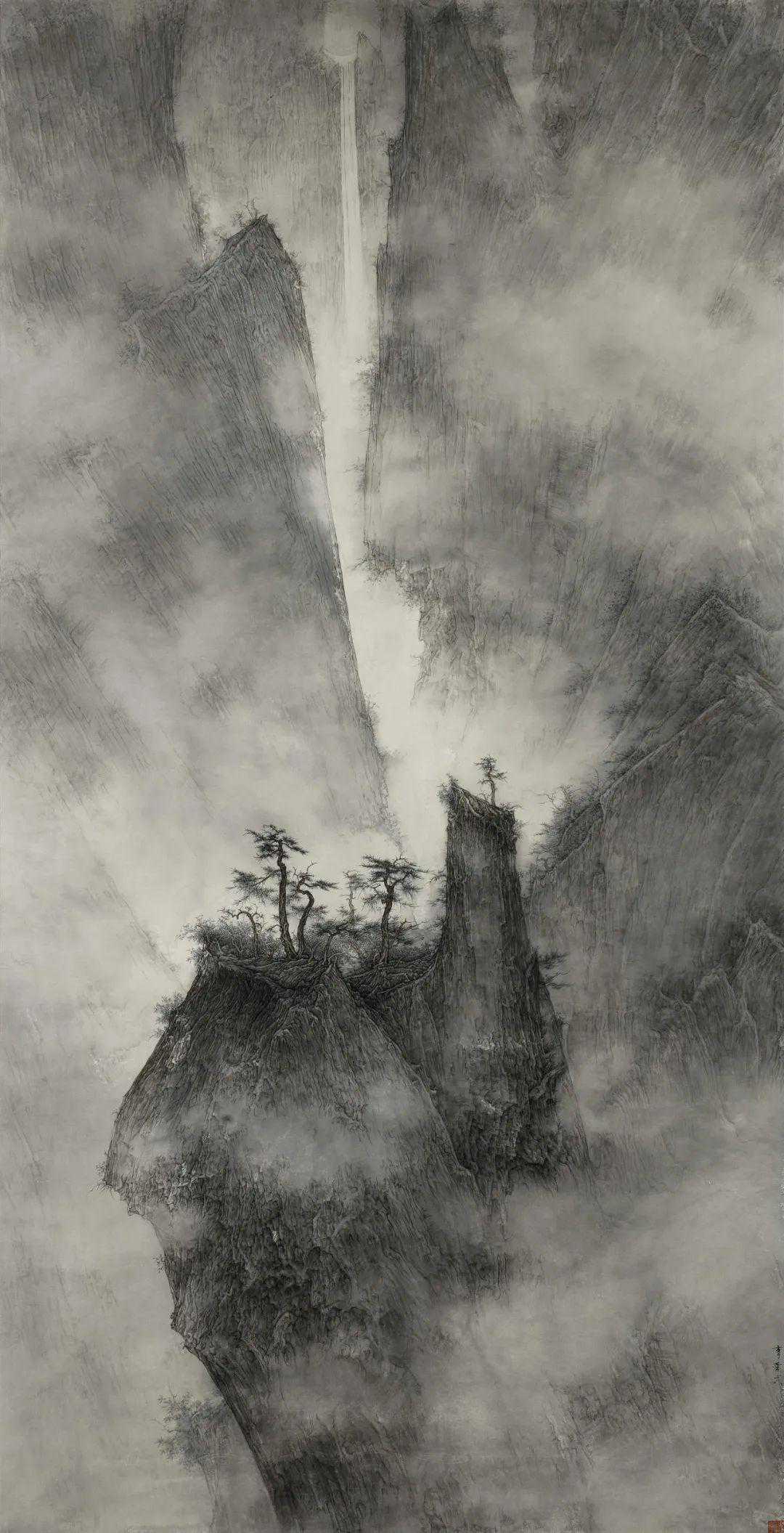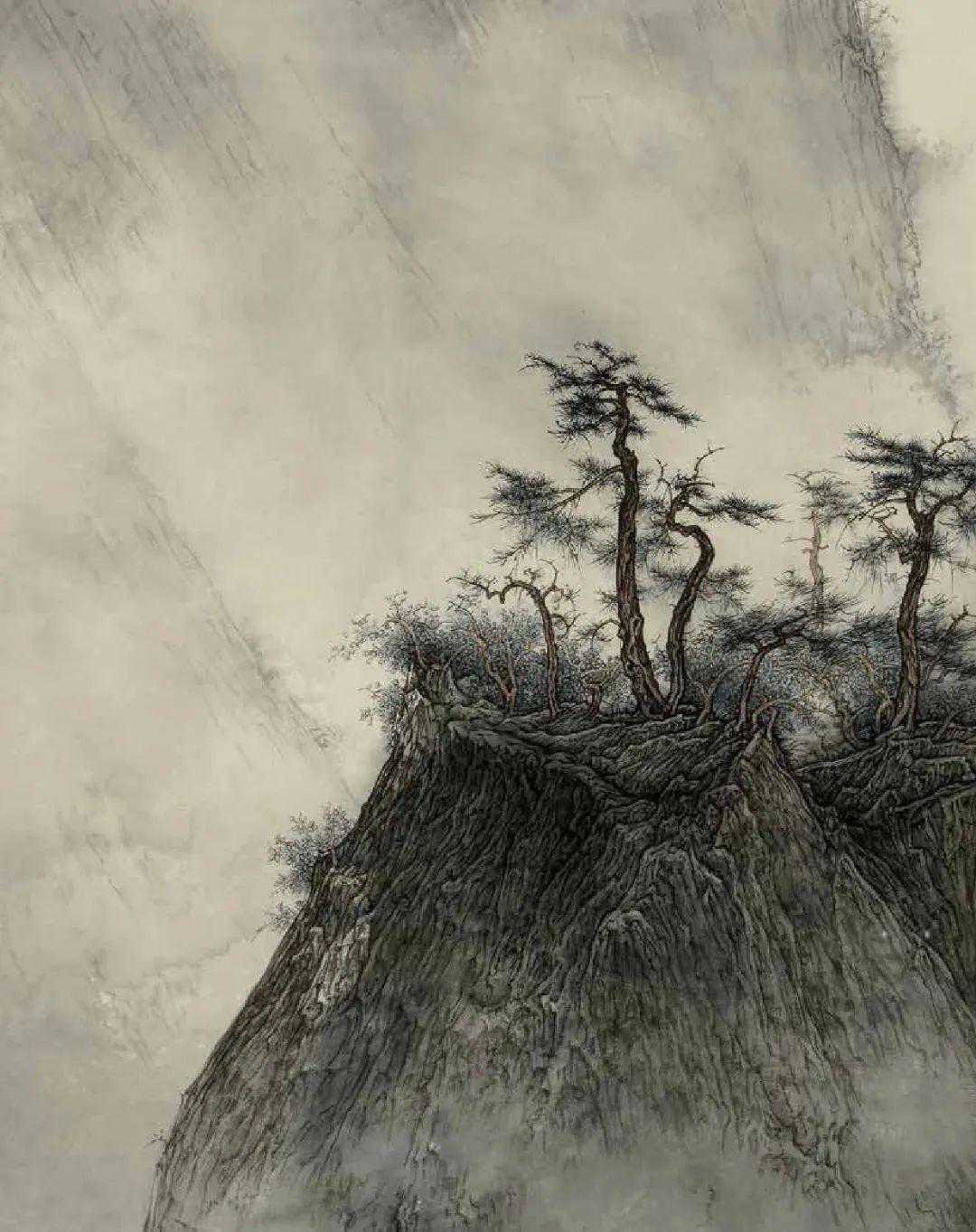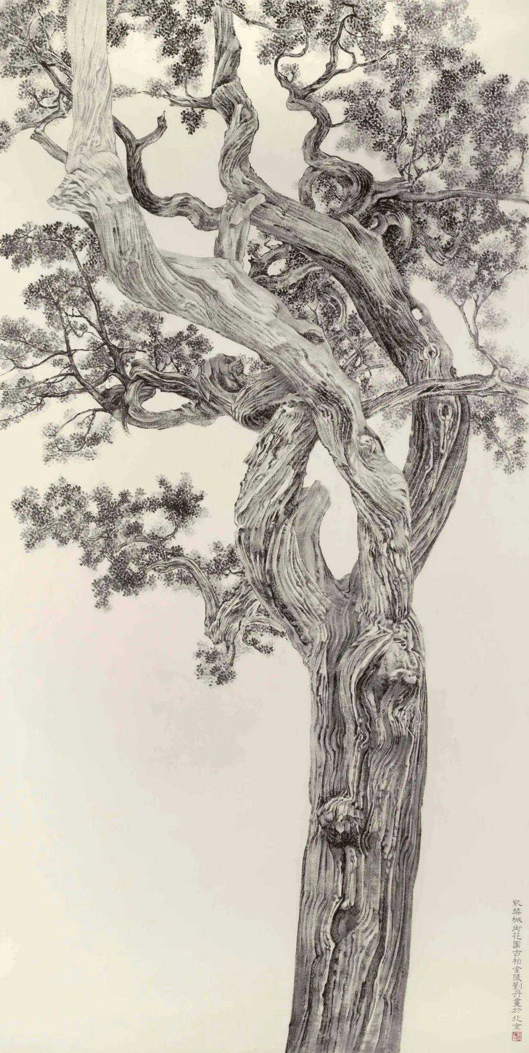领衔作品为一幅尺寸恢弘的刘丹画作《紫禁城御花园古柏》。刘丹虽有幸师承水墨名家亚明先生,但能突破所学,创造出超越传统水墨并富戏剧性的表现手法。他的作品将物象从环境中抽离,通过放大或聚焦等富有张力的手法使之与真实拉开距离。刘丹的作品大多描绘岩石或花卉,如《紫禁城御花园古柏》般以树木为题者十分罕见。