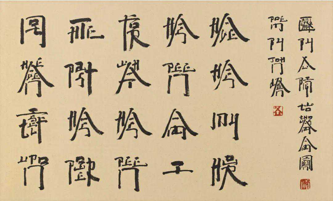 徐冰最知名的设计之一是其“英文方块字”书法,本拍品就是这个体系的代表作之一。“英文方块字”书法,又称“新英文书法”,是一种将英文或其他罗马字母的字以汉字形式表现出来的方法。本拍品文本实际上出自约翰·德莱顿(JohnDryden,1631-1700)的诗作《快乐的人》(HappytheMan)。方块字书法迫使观众重新调整他们的阅读方式,并提出关于语言的文化假设的问题,给观者带来一种重新学习阅读的体验。