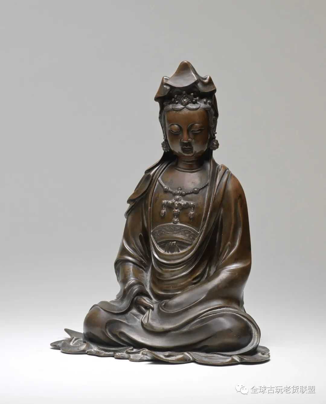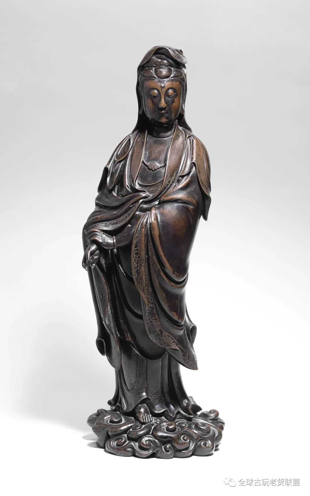 本场重点青铜雕塑拍品是一尊铜嵌银丝观音立像。其稀有性不仅在于工艺精湛,还因其体幅宏大,并附「何朝宗」印章,点出德化白瓷和青铜器之间的关联。