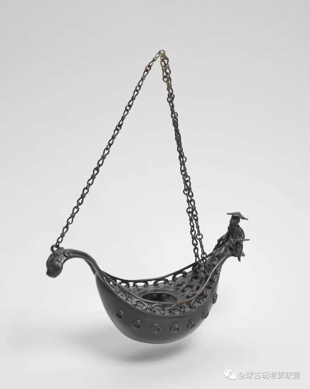 另一件重要作品明仙人乘槎挂式铜吊炉:它虽然是一个香炉或香瓶,其形状则可能是受到中亚和波斯的托钵(kashkul),或所谓的「施舍钵」的启发而来。