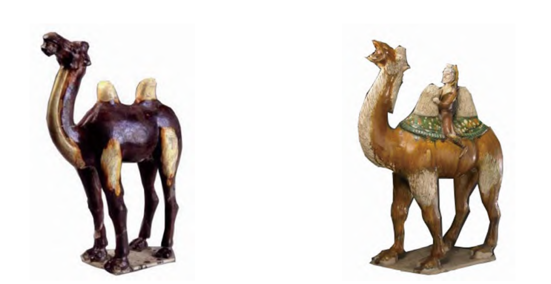 巩义窑制作的骆驼塑像或作嘶吼状,或作驻立状,其背上还有丝路货物、乐俑、胡商等,骆驼本身肌肉饱满,上绘以三彩装饰,以增加美感和立体感,充分展现了唐代陆上丝绸之路的盛况。