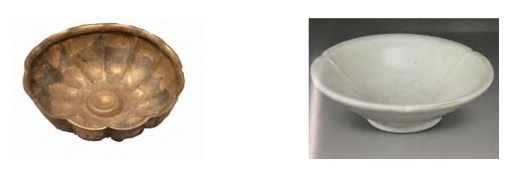 唐代的陶瓷工匠们有意将金银器的造型仿用到陶瓷制作中,丰富了陶瓷器的种类。如2005-2007年间在巩义白河窑遗址出土的这件白釉葵口碗(图15),圆唇、敞口、弧腹、圜底、三曲葵口且出筋,就充分表现出仿金银器的造型特征。