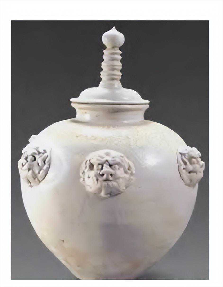 图27唐代白釉兽面贴花罐(巩义市博物馆藏)
