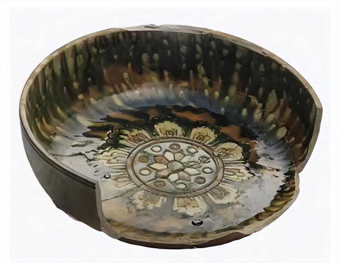 宝相是佛教徒对佛像的尊称,宝相花(图30)一般是用某种特定花卉(如牡丹、莲花等)作为主体,在中间镶嵌着大小粗细有别、形状不同的其他花卉组成,用圆珠作规则排列,使花心和花瓣基部如宝珠一样,形成比自然形象更加华丽的一种理想之花。莲花是我们熟悉的佛教圣花,在佛教中象征着神圣与不灭。莲花纹通常有多层,花瓣分张,莲籽突露。受此影响,巩义窑生产的陶瓷器尤其是三彩器的装饰大多有莲花和宝相花装饰。如巩义黄冶窑遗址出土的这件唐三彩洗(图31),其内底模印有宝相花纹饰,采用绿、黄、白三种色釉相间搭配,展现了浓郁的佛教文化色彩。