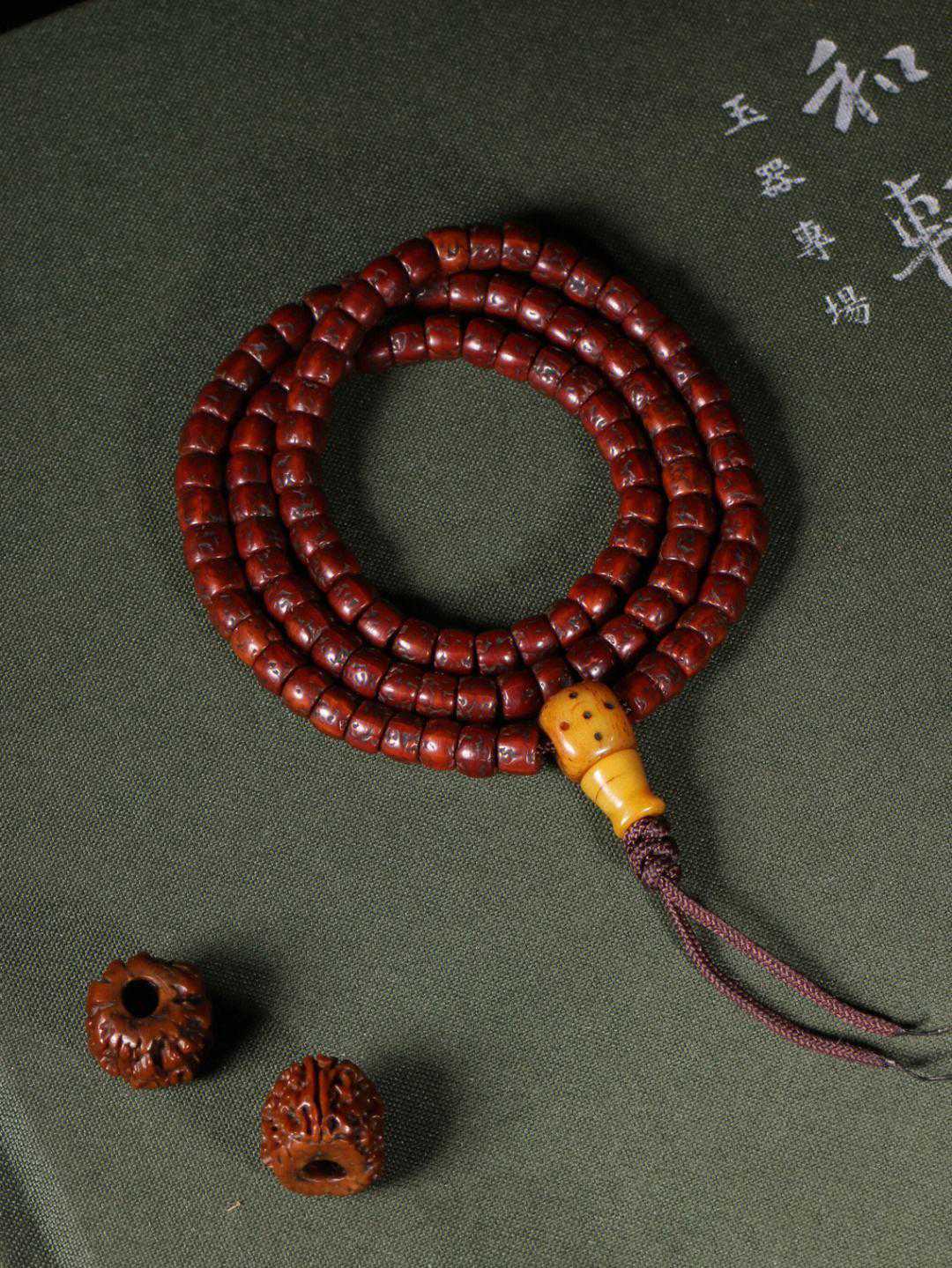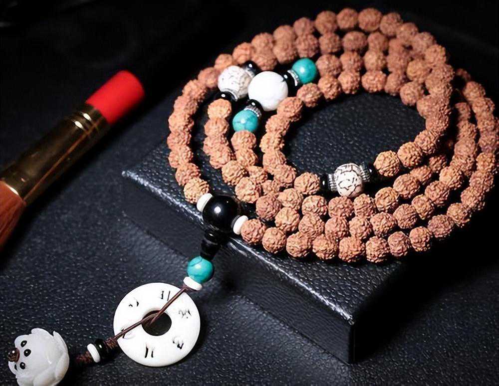 2、配饰要和整条金刚菩提手串保持一致,在选择配饰时最好要和金刚菩提手串保持一致。比如你买了一条比较大的金刚菩提手串,但是你又想搭配一些小而精致的配饰,那么这时你最好选择与手串相配的配饰来点缀一下。例如:一条小而精致的手串,配上一条小巧精致的小核桃和一个小巧精致的小葫芦。