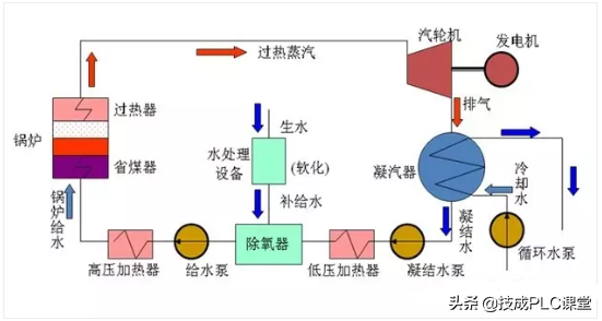 火力发电厂的汽水系统是由锅炉、汽轮机、凝汽器、高低压加热器、凝结水泵和给水泵等组成,它包括汽水循环、化学水处理和冷却系统等。水在锅炉中被加热成蒸汽,经过加热器进一步加热后变成过热的蒸汽,再通过主蒸汽管道进入汽轮机。由于蒸汽不断膨胀,高速流动的蒸汽推动汽轮机的叶片转动从而带动发电机。为了进一步提高其热效率,一般都从汽轮机的某些中间级后抽出做过功的部分蒸汽,用以加热给水。