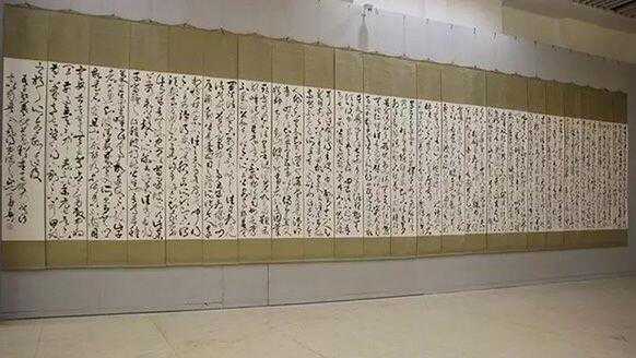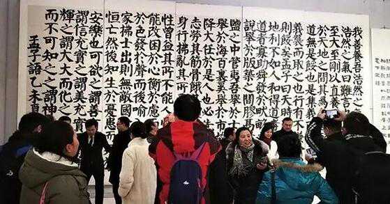 王岳川教授展出的作品十幅,基本上为十米左右大作品,内容有甲骨文书法《诗经·周颂·敬之》、隶书《尚书·大禹谟》句、篆书《易经·系辞上第五章》、草书《史记·孔子世家》句、临王献之《草书五帖》,楷书《孟子》句,长8.6米,高3.7米,临王羲之行书《兰亭序》长12米,高3.7米,临王羲之草书《十七帖》长13米,高2.4米,还有两幅精致的小楷书法。