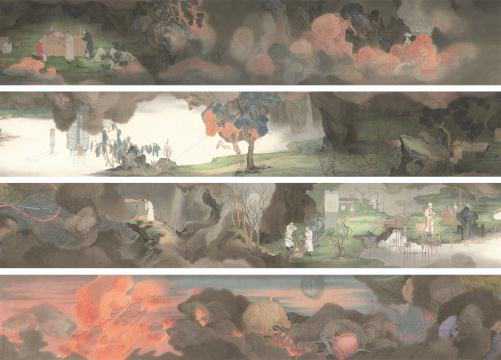 毫无疑问,郝量的创作过程非常辛苦。他的绘画可以花费一到两个月的时间来完成,而手卷则需要六个月的时间。他在纸上制作草图,然后再画于他的主要材料——丝绸——之上。之后,他添加提取自植物和天然原料的定制涂料,通常需要添加数十层以达到他预想的色调——通常是一种近似泥土的灰色,这种色调与对于传统的实践保持一致。