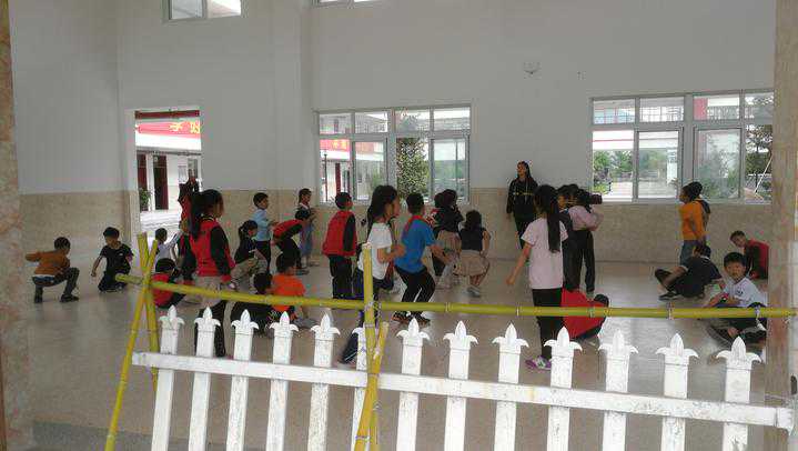 5月8日下着小雨,新碧街道碧川小学教学楼的门厅里,低年级的同学在上健美操课,一道围栏将他们和数米外的工地隔开,那是正在修建的运动场。正是这一工程的迟滞,让碧川小学成了“蜗牛奖”得主。