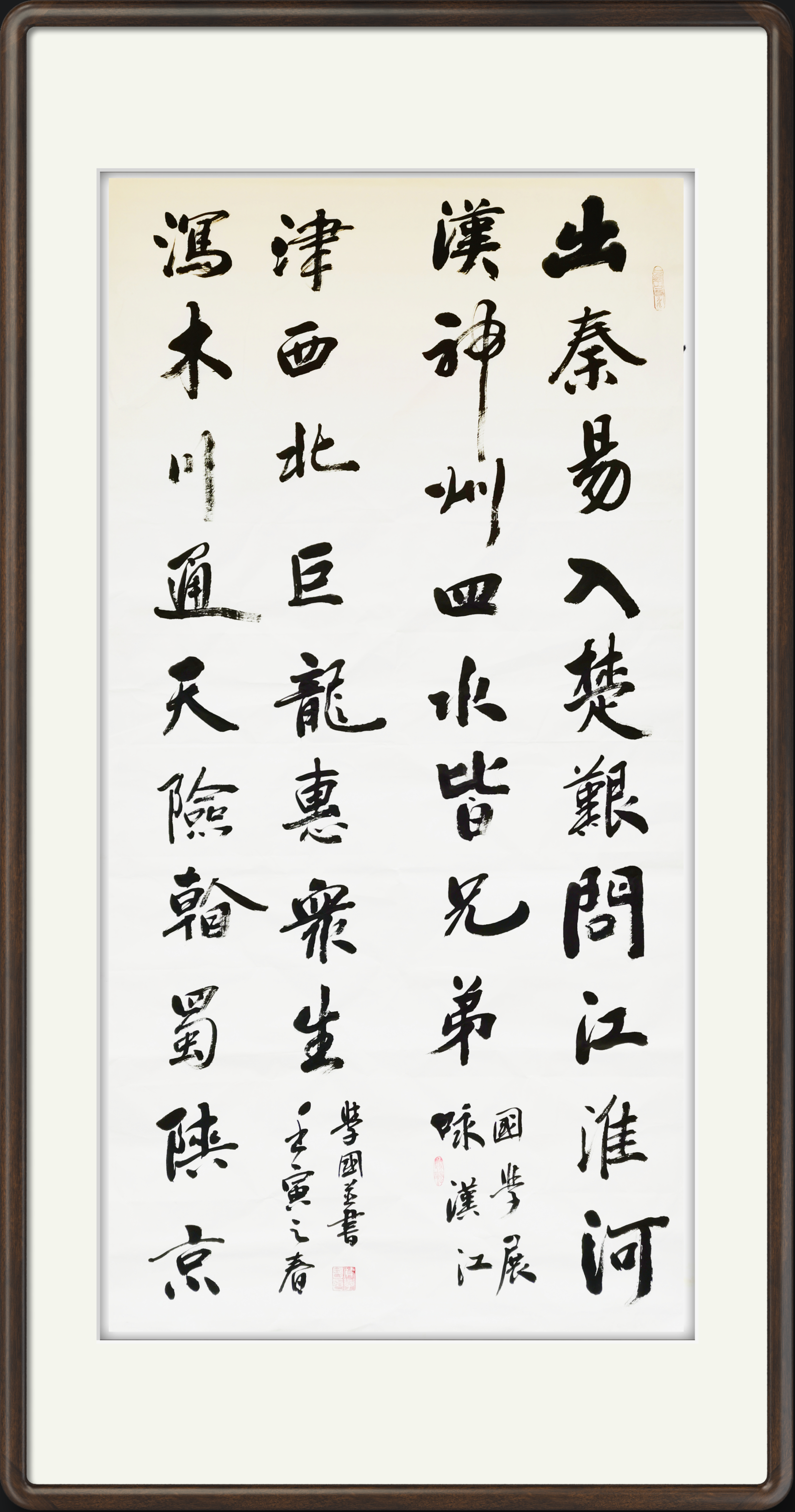 贾学国书法作品以七分骨三分肉为特质,楷行草隶篆五体兼备,各有特色,独具神采。雄浑、古朴、厚重、多变,凝神贯气,书印一体,诗联书胸襟,笔墨展才情。曾三次参加中国教育电视台书画春晚节目,接受中国教育电视台记者专访。
