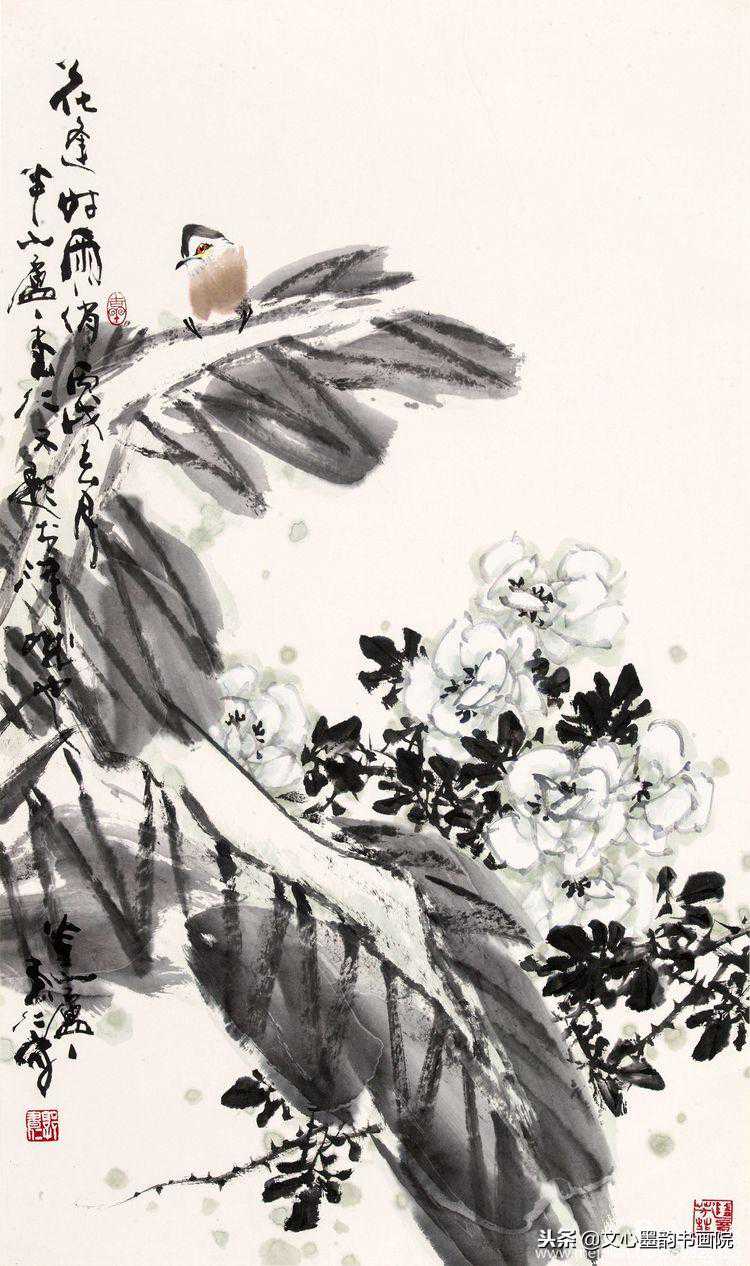 郭书仁的花鸟画笔精墨妙,赋色淡雅,画面静爽宜人,具有诗一般的韵味和情调。这首先与他恬静平和的心态有关,他认为能有和平良好的画画环境就心满意足了,对物质生活从不奢求,对功名利禄也无非分之想,一切都自然而然,顺理成章。他的画作不浮不燥,沉静高雅,实乃得利于他修炼有素的“不激不厉”的祥和心境,古人说“画乃心境”,正此之谓也。他喜用长锋羊毫笔,运笔时多中锋、侧锋互用。画横枝或土坡时常用拖笔或逆锋,所画花枝形象若有不足,则以戳点擦染辅之。技法虽灵活多变,但能干脆利落,自成家法,独得一定之规。他多以行草书法用笔入画,所勾写皴拖的笔触顿挫有致,时续时断,跌宕起伏,似无实有,具有空灵活跃的艺术效果。他在以线造型中强调用笔的灵妙性,虚幻性和意象性,不喜欢机械死板的写实或描摹,这使其作品具有“以书入画”和“以意为画”的传统魅力。他喜用温润灵动的水墨,尽量使画面造成水量墨章的爽人氛围。其水墨运用的根基仍在用笔,即以书法为基础的骨法用笔,故能使其大块水墨或彩墨酣畅淋漓,辉光奕奕、力透纸背。其所画荷叶、芭蕉叶、奇石等皆以阔笔泼写,饱墨戳点而成,间以渴笔石色皱擦补缀,使画中形象出现黑白对比、色墨对比、浓淡对比、干湿对比,令人感到鲜明、强烈、灵妙、活泼,可谓大雅宏达。其构图严谨明快,简约练达,令观者赏心悦目、一目了然,从不拖泥带水,颇得置陈布势之妙谛。