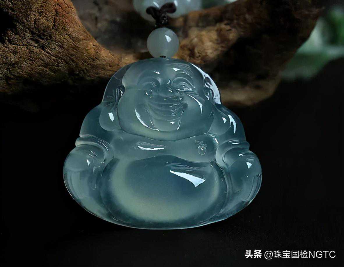 “起荧”并不是指翡翠在紫外光下具有荧光效应,而是指翡翠内部随着其摆放位置的改变而漂浮在表面的亮光,是一种光学现象。这种现象常见于表面抛光精良、透明度与质地较好的翡翠上。下图佛肚上就能看到一种很柔和、朦胧的光斑,这个就是翡翠的“起荧”。