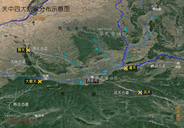 从地理概念讲,关中是指“居四关之中”而言。关中之名,始于战国时期,一般认为西有散关(大散关),东有函谷关,南有武关,北有萧关,取意四关之中(后增东方的潼关和北方的金锁关两座)。四方的关隘,再加上陕北高原和秦岭两道天然屏障,使关中成为自古以来的兵家必争之地。古人云:“关中者,天下之脊,中原之龙首”。关中土地肥沃,河流纵横,气候温和,《史记》中称其为“金城千里”、“天府之国”和“四塞之国”。