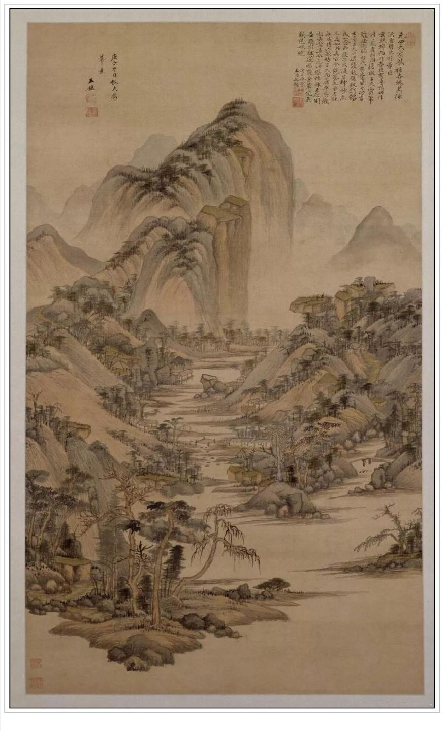 本幅右上有王时敏题:“元四大家风格各殊,其源流要皆出于董巨。玄照郡伯于董巨有专诣,所作往往乱真。此图复仿子久而用笔皴法仍师北苑,有董巨之功力,又有子久之逸韵,瓶盘钗钏镕成一金,即使子久复生,神妙亦不过如此,真古今绝艺也。余老钝无成,时亦欲仿子久而粗率疥癞,相去愈远。今见此杰作,珠玉在侧,益惭形秽,遂欲焚弃笔砚矣。叹绝愧绝!庚子仲冬王时敏题”。下钤“王时敏印”、“逊之”印,引首钤“归邨”印。