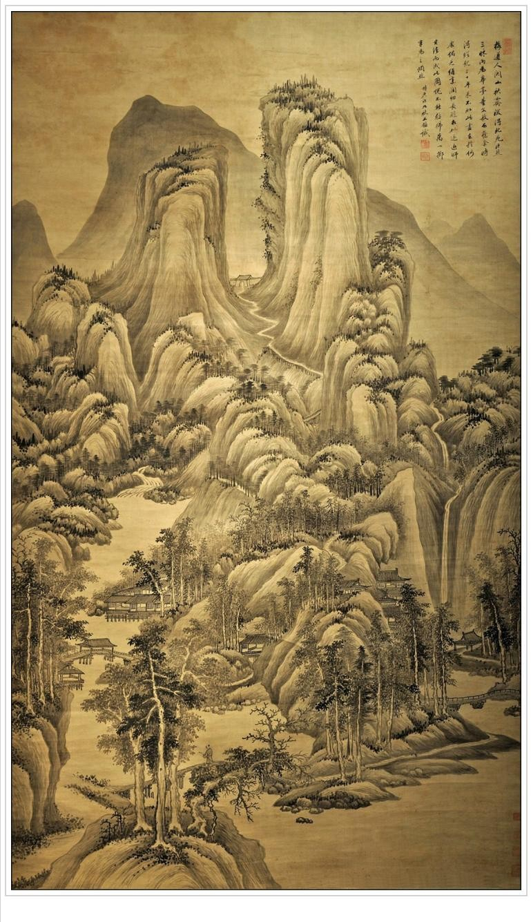 《仿巨然山水图》,王鉴,纸本设色,纵217横101厘米,藏于上海博物馆。