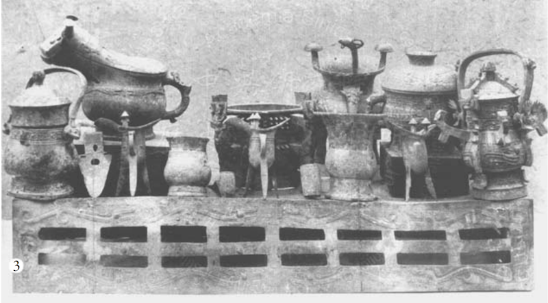 从战国宴乐图所见的春秋饮酒场面看,酒尊或放在地上,或放在有足的架子上,两种情况都有。架子的形状类似于俎。酒尊放在架子上,就便于站立酌酒,不必弯腰,这是比较适合于立饮,适合礼书所描述的那种主宾频繁移动、彼此献酒的场面的。
