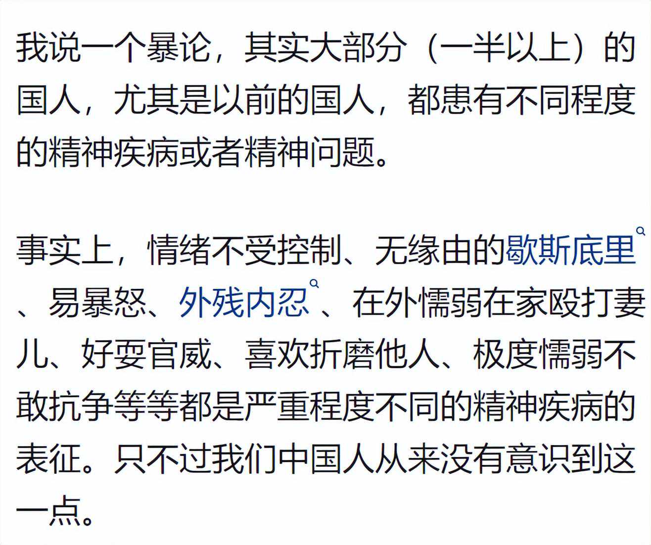 历史的朝代更迭或者某些事的发生,很多正常人(具有勇敢坚毅向上精神的人)都被血洗了,剩下的都是胆小懦弱畏光的人(和被血洗的人相比较)。然后基因不断的传递繁衍,这些基因留在了这里。别的我什么也不敢说,有时候我觉得自己也是个病人,也许大家都是病人呢!