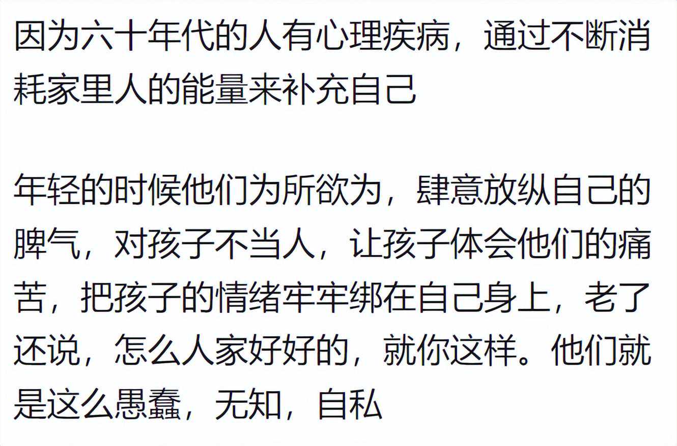 因为那些没有做到的人他们是没有做到,但他们认识的很多人都做到了所以他们觉得他们的思维就是正确的因为他们见识到那代人人是怎么做起来的感觉80后最有意思,既能理解60,70的辛苦和傲慢,又能理解90,00的独立和自由。但自己到底是啥?不知道。。。狠绝的话说尽,狠绝的事儿做尽,那个年代不愚蠢,不自私,不无知根本就活不下去。我爸爸地地道道农村人,跟我说小时候读书,家里大人都不同意,总挨骂,说谁谁谁又割了多少草,锄了多少地,就他要读书,什么事都做不了。都看到这儿了