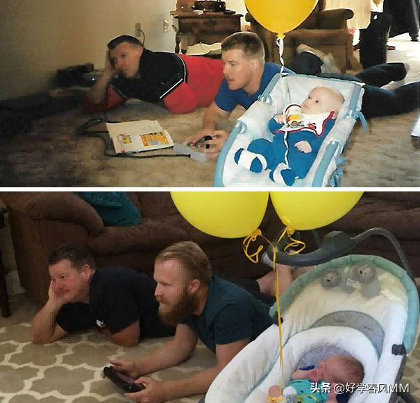 第一张是1989年,第二张2016年,爷孙三代,现在我的孩子代替了我的位置,我代替了我爸的位置。