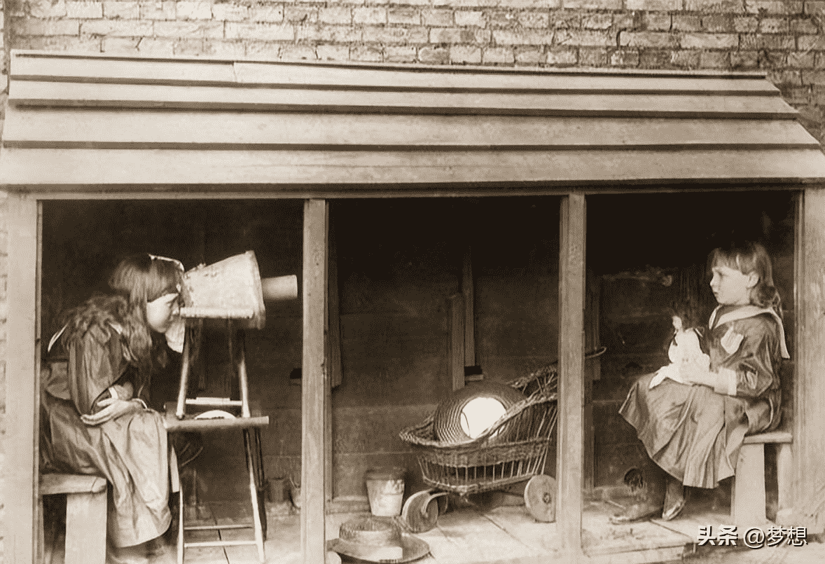 1887年,两位小女孩正在玩拍照的游戏,其中一位小女孩,用凳子和花盆,制作出了一台“照相机”,她正在给自己的朋友拍照片。另一位小女孩,手里抱着娃娃,身前还放着一辆婴儿车,虽然她们的相机是假的,但是一旁的摄影师觉得有趣,便拍下了这一幕。