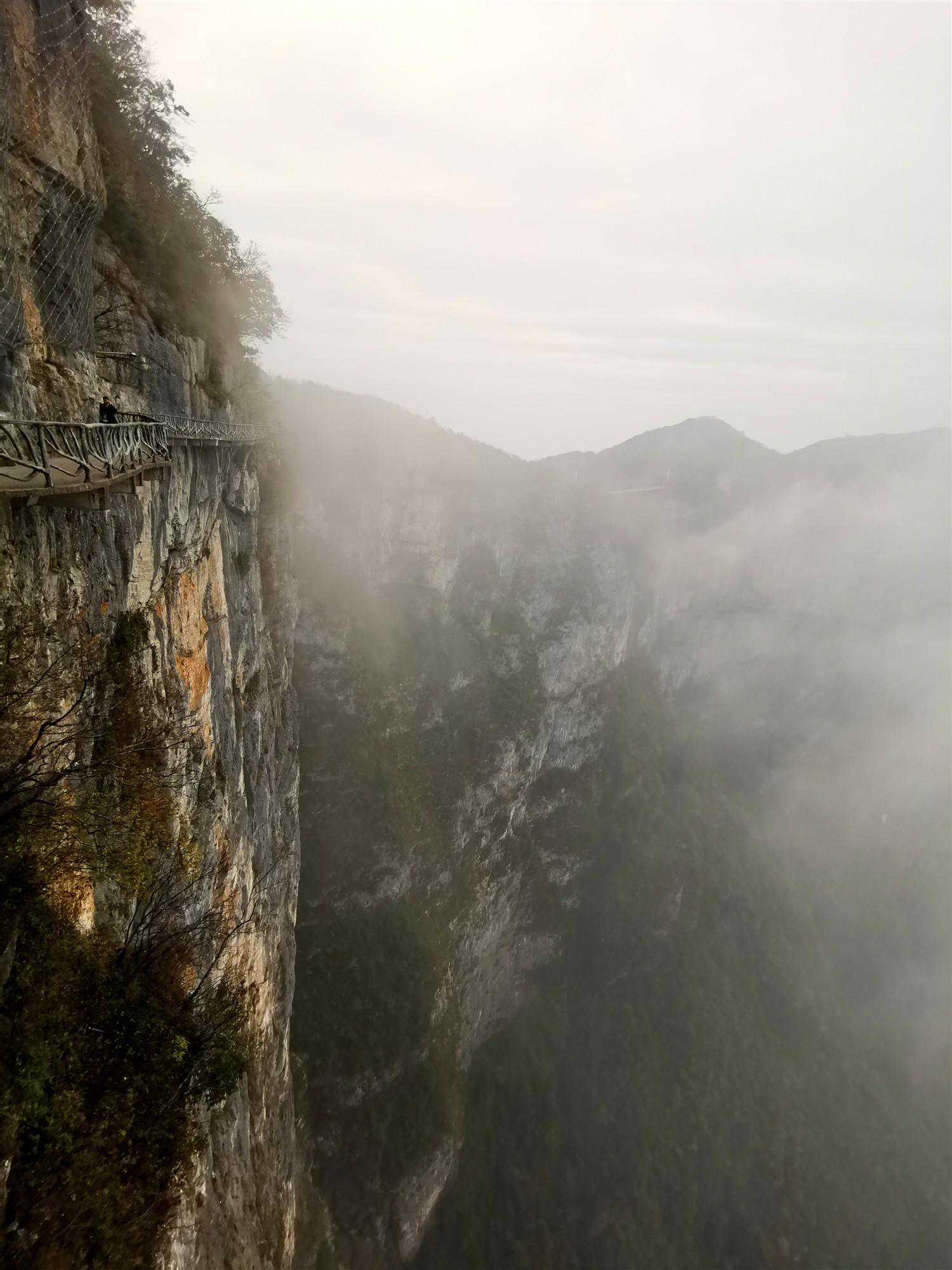 天门山鬼谷栈道最为险峻的栈道,一条小小的栈道围绕着独立的山体悬挂在险峻的万丈悬崖边,全长1600米。行走在栈道上,心跳加速,紧张得让人窒息。这一切美景让人叹息,大自然的宏伟。这里是接近天的地方,悬崖边被云雾围绕着看不到底下的深渊,让人置身于云端一样。