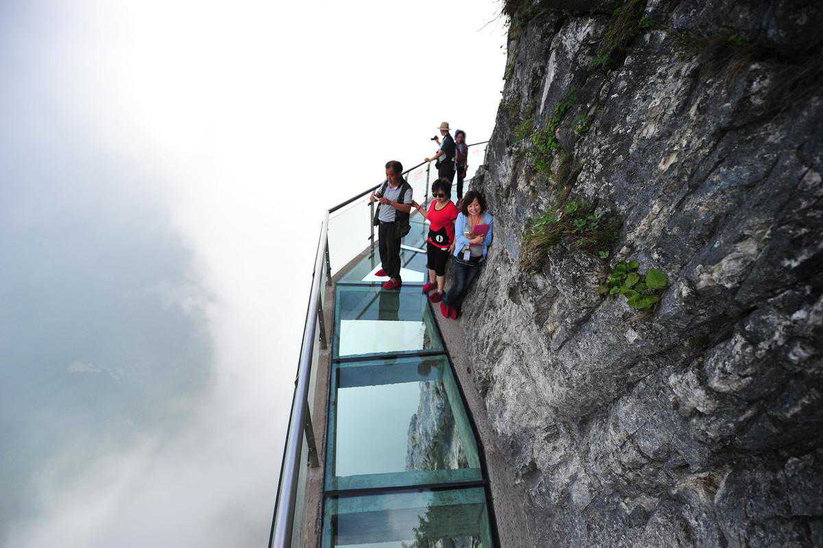 天门山玻璃栈道坐落在险峻的悬崖边上,其中盘龙崖玻璃栈道是天门山最长的玻璃栈道,该栈道全长100米,宽1.6米,站到栈道上可以俯瞰天门山99道盘山公路,绝壁凌空,让双脚不自觉的颤抖起来。